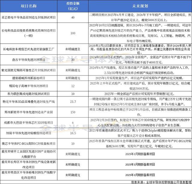 今年以来,一系列先进封装项目如雨后春笋般涌现,为行业发展注入了强大动力。全球半导体观察曾在2月下旬统计了超过15个先进封装项目,近期行业内再新增多个先进封装项目,包括总投资40亿元的亚芯微电半导体晶圆制造及封装测试项目正式开工,重庆市长寿区/荣昌区以及梁平工业园区三个先进封装项目已完成新备案。